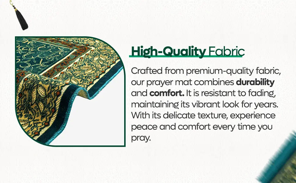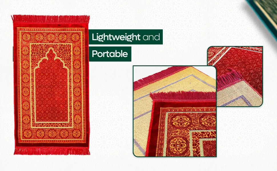 While some rugs are made of silk, wool, or cotton, we choose velvet for its balance of luxury, durability, and comfort. It serves as a soft prayer rug that offers a plush feel similar to a memory foam prayer mat but remains easy to fold and carry.