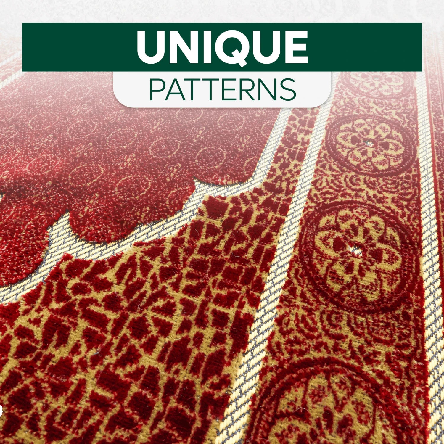 - Elegant Islamic Design: The rug features a classic Mihrab (arch) design in shimmering gold tones against deep royal red, framed by an ornate border of traditional floral medallions to help you orient towards the Qibla with focus and beauty.