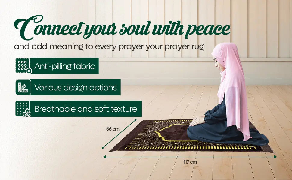 Experience the perfect balance of spiritual tradition and modern convenience. Our mats are lightweight, easy to maintain, and crafted from soft velvet to provide comfort during every Salah.